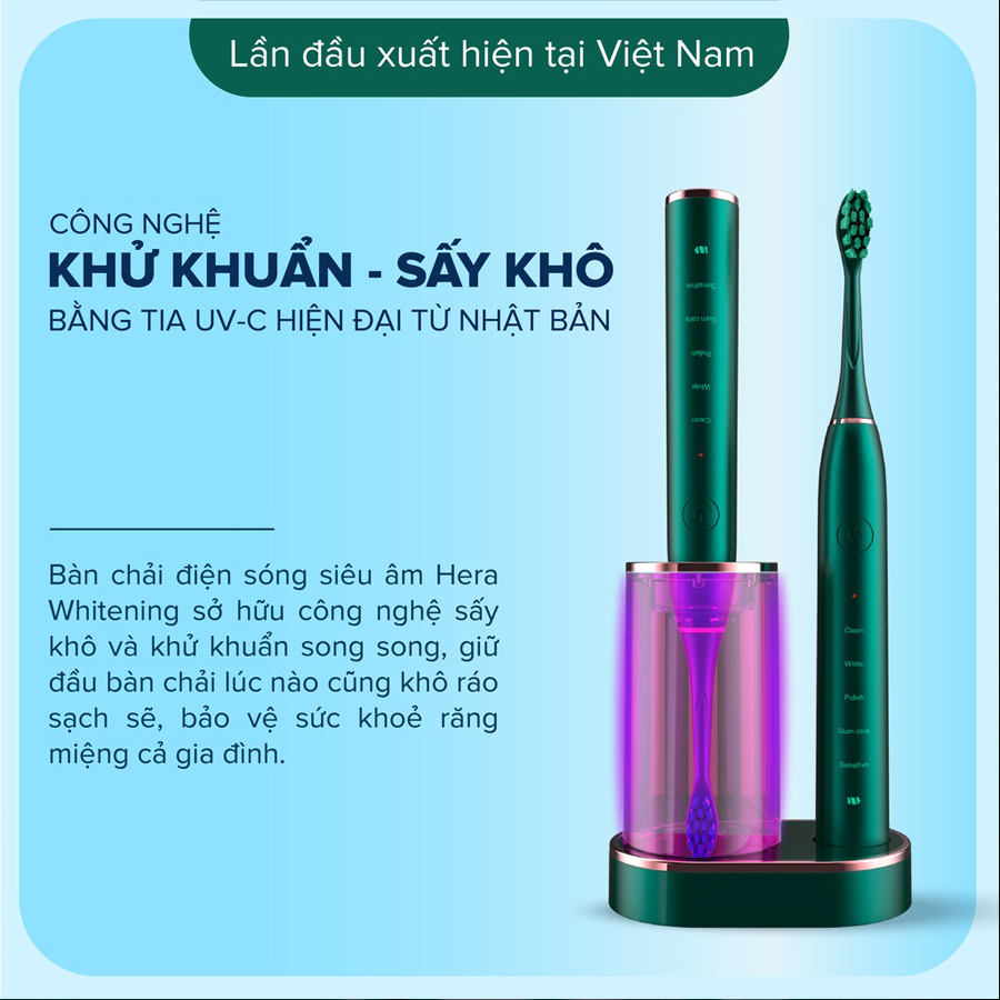 – Công nghệ sấy khô, khử khuẩn bằng tia UV-C từ Nhật Bản diệt sạch đến 99% vi khuẩn gây bệnh tích tụ trên đầu bàn chải đánh răng sau mỗi lần sử dụng vô cùng an toàn, hiệu quả.